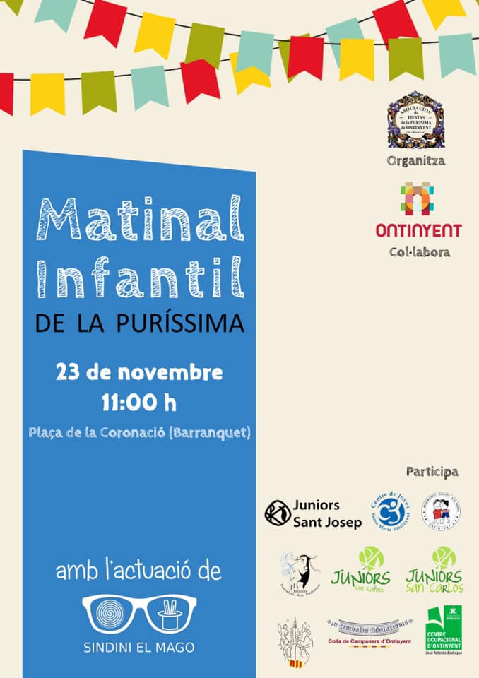 El sábado 23 a las 11:00 h. en la plaza de la Coronación tendrá lugar La Matinal Infantil de la Purísima donde los más pequeños de la casa y no tanto, podrán disfrutar de juegos, talleres, bailar danzas y diferentes actividades preparados por diferentes entidades del pueblo.