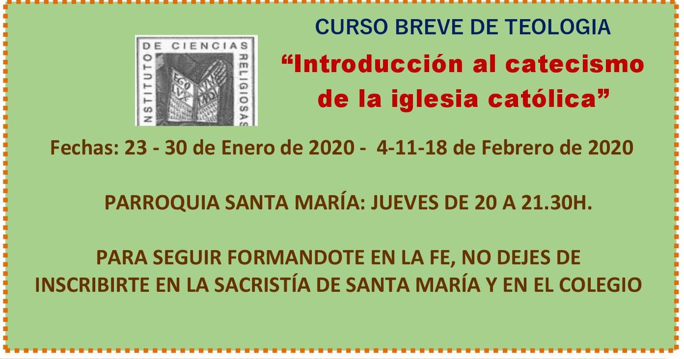El jueves 23 de enero dará comienzo el curso breve de Teología «Introducción al catecismo de la Iglesia Católica». Se realizará en la Casa Parroquial de 20 a 21 horas, los días 23 y 30 de enero, 4, 11 y 18 de febrero.