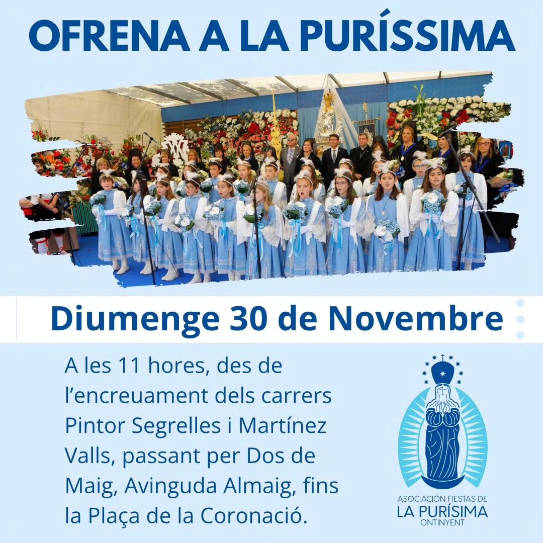 El proper diumenge 30 de novembre OFRENA A LA PURÍSSIMA a les 11 hores, de de l’encreuament dels carrers Pintor Segrelles i Martínez Valls, passant per Dos de Maig, Avinguda Almaig, fins la Plaça de la Coronació.