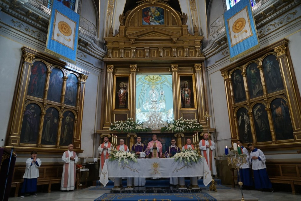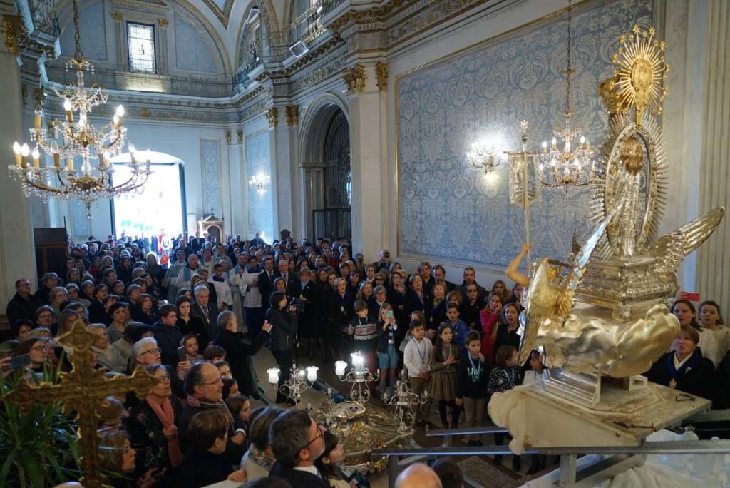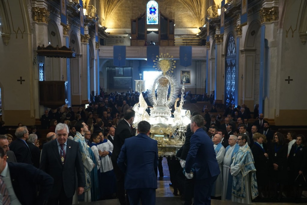 El domingo, ornado de impactante sol y belleza, amaneció ataviado con la singular gratitud que todos brindamos a la hermosa imagen de la Purísima que sobre el trono de ángeles, gubiados por imaginero Virgilio Sanchis Sanchis, rubricaba la solemnísimos festejos. El templo de Santa María, en cuya capilla, tiene su sede canónica nuestra Patrona.