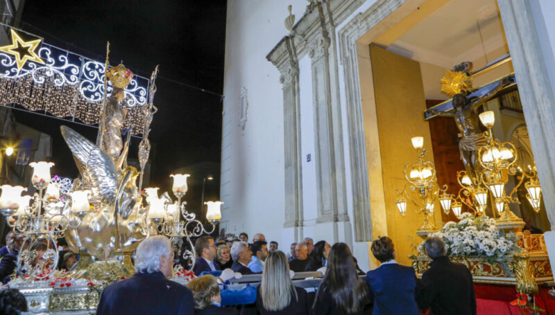 Enguany va ser molt emotiu el moment de la processó: l’encontre de la Puríssima i el Crist de l’Agonia a les portes de l’església de Sant Carles. Com que des de l’Associació de Festes de la Puríssima s’havia anunciat aquest encontre històric, davant de Sant Carles es van donar cita centenars de persones que volien presenciar l’acte.