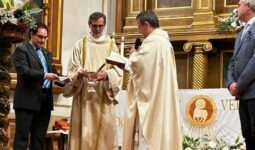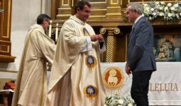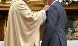 A continuación, el asistente eclesiástico de la asociación, don Antonio Ferrando Martí, procedió a la imposición de la insignia de oro acreditativa del cargo de presidente, felicitando al nuevo responsable y animando a la junta entrante a trabajar con ilusión y compromiso por el engrandecimiento de las fiestas patronales de la Purísima Concepción, así como por el acercamiento de los jóvenes a estas tradiciones religiosas.
